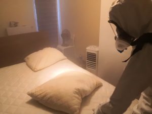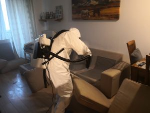 - Zamgławianie ULV – w trakcie zabiegu wytwarza się delikatna mgiełka, która wnika w nawet najmniejsze szczeliny doprowadzając do śmierci insektów. Co ważne nie pozostawia zacieków, plam, smug na ścianach i wyposażeniu pomieszczenia, powierzchnie są jedynie delikatnie zwilżone.